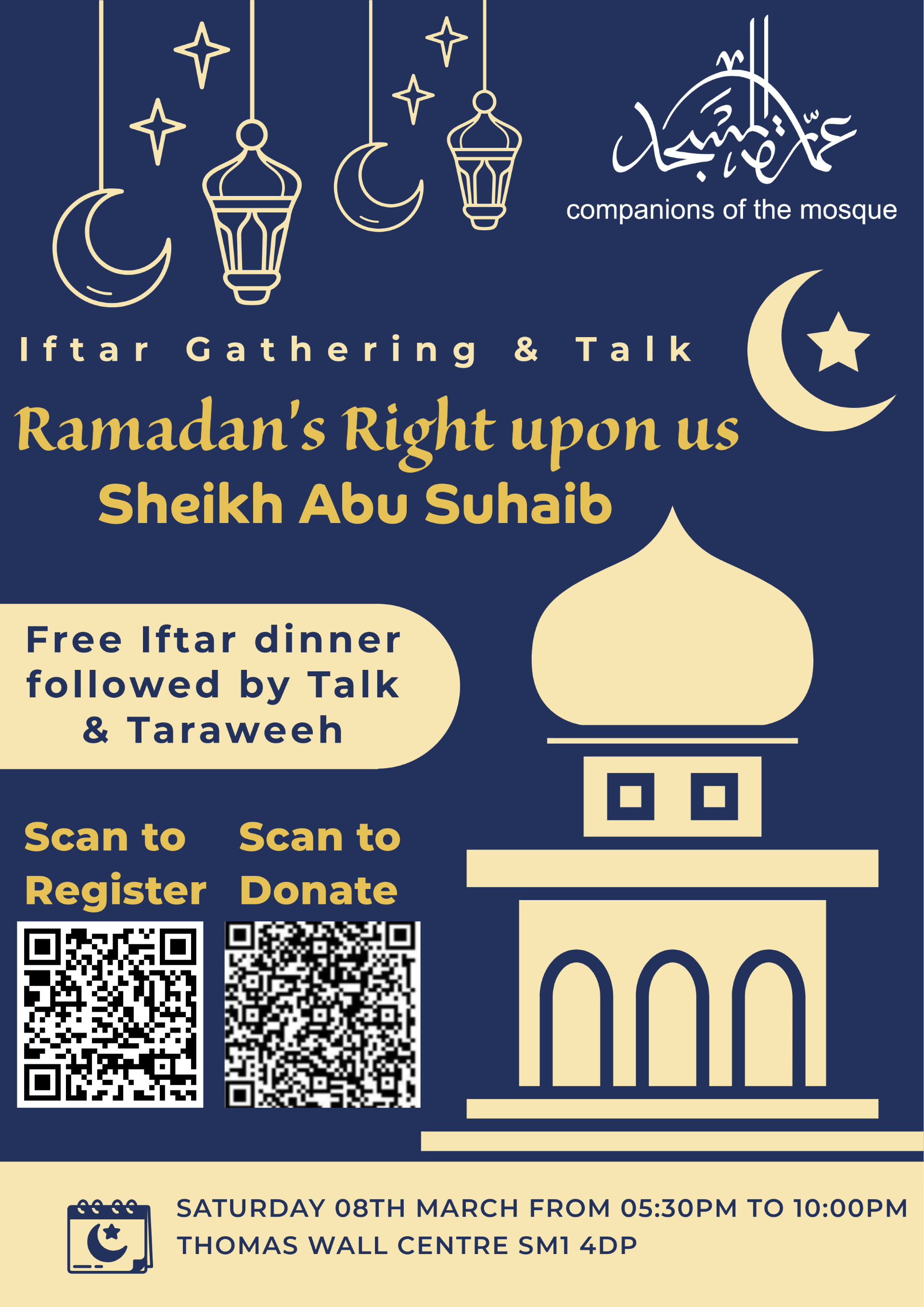 Click here to register your interest Companions Of the Mosque (COM) inviting you to Iftar gathering with our Shaikh Abu Sohaib. Followed by: